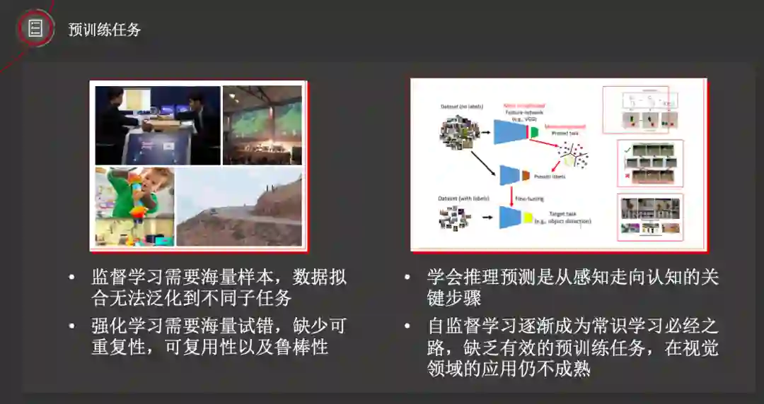 深度学习大量依赖于可标注的数据,但是很多场景下,数据标注成本很高。同时,标注数据也存在一个致命的问题,即知识表达不准确——比如在自动驾驶中,我们有大量的标注信息,但这些标注数据是否真的“最适合”自动驾驶任务呢?此外,人类对外界的感知依赖于常识,而依赖于标注数据来训练的模型则存在缺乏常识的问题。