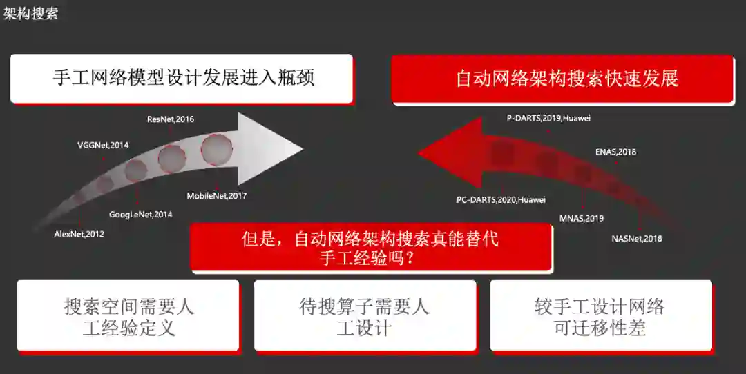 田奇博士认为,NAS目前存在三大挑战,分别为:1)搜索空间仍需人工经验定义;2)待搜算子需要人工设计;3)相较手工设计网络,可迁移性较差。