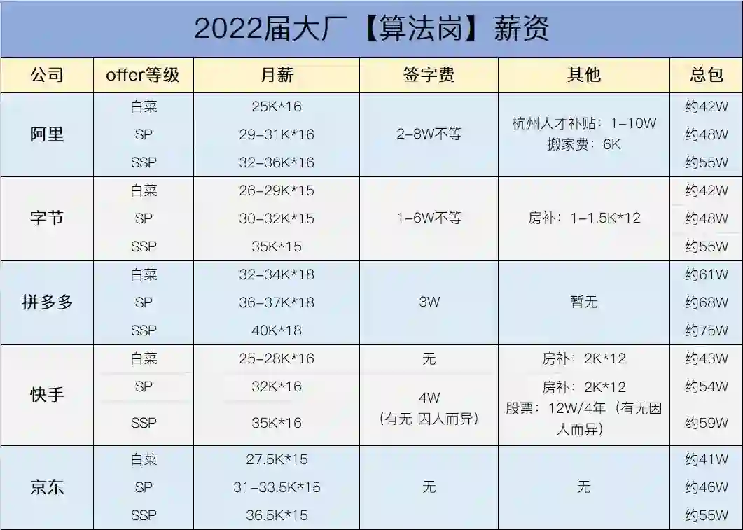 对于算法岗来说,一线互联网大厂的白菜档 offer 基本年总包 40 万左右,拿到 sp 或 ssp offer 的同学甚至能高达年总包 50-75 万!