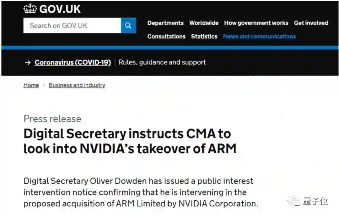 今年1月份,老黄前脚刚说完要在2022年完成对ARM的收购,后脚英国政府网就发布公告,确认正在干预英伟达收购ARM交易:
