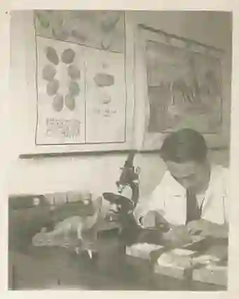 青年周明镇在观察标本