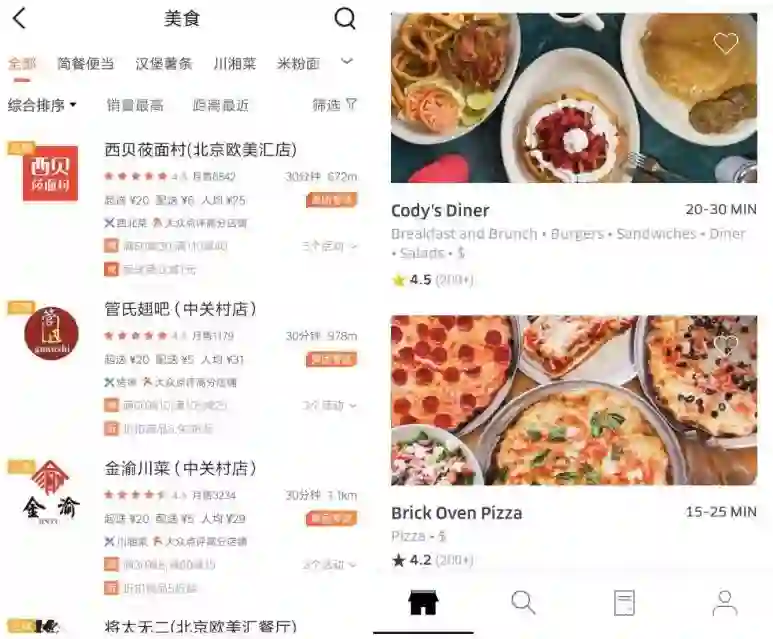 ▲ 美团 (左) & Uber Eats (右) APP截图
