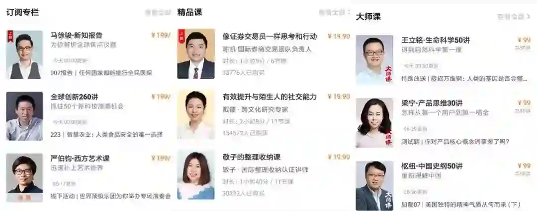 在国内的知识付费领域内,较为火爆的产品一般多为“新知”(如商业认知、创新、创业等相关)、“大家都感兴趣的高等教育知识”(如经济学、金融学、历史等)、“实用职业技能”(如营销、增长、时间管理、写作等)这样几类。