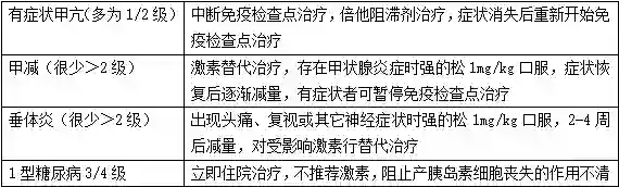 irAEs有时是致命性的,迅速识别很重要,2级免疫相关毒性时免疫检查点治疗暂停,症状≤1级时重新开始,3/4级免疫毒性,免疫检查点治疗永久停用。腹泻/大肠炎、肺炎风险很大,需住院激素治疗,停用免疫检查点治疗,治疗前应告知患者注意排便习惯改变、腹痛、血便、体重下降、发热和呕吐等胃肠道症状,1级腹泻只需普通止泻药,但需密切监控,2级腹泻免疫检查点治疗暂停,3/4级时需激素治疗。