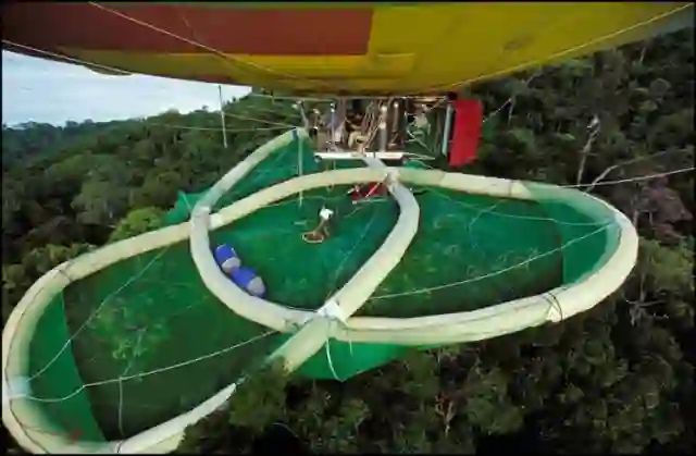 有的时候科学家会用充气的管子做为骨架,套上一张巨大的网做成“气垫船”,然后用热气球把船带到树冠上去,研究者们就可以悠闲地坐在“林冠气垫船”里做实验了。
