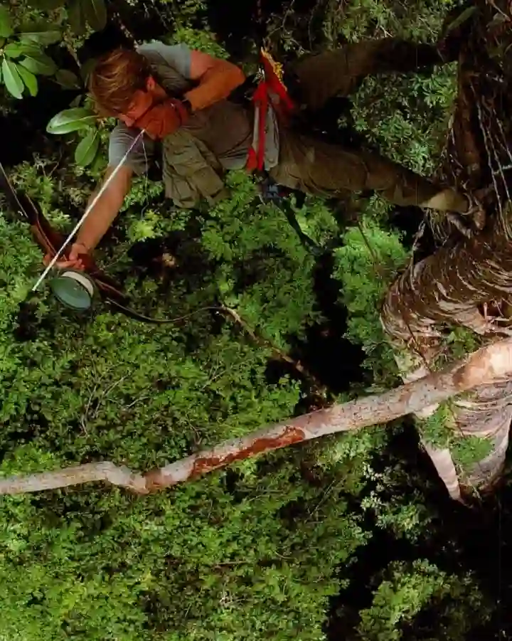 科学家利用单绳技术吊在婆罗洲一棵15层楼高的榕树上,用反曲弓向旁边一棵树发射引导绳(鱼线)。图片:Moffett / Harvard University Press(1993)