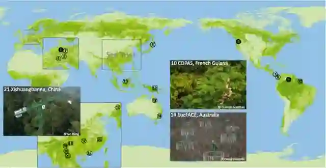 世界范围内的林冠塔吊分布图。图片:Nakamura A / Trends in Ecology & Evolution(2017)