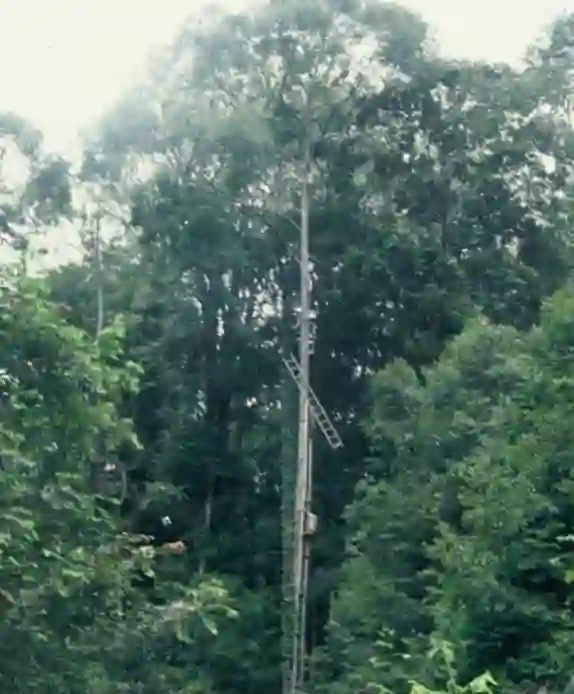 这也是一个一劳永逸的方法,在森林中修一个铁塔,一直达到林冠。这种方法现在主要用来研究森林的微气候、森林与大气的气体交换等,铁塔上通常会装上好多测量仪器,实时监测记录数据。