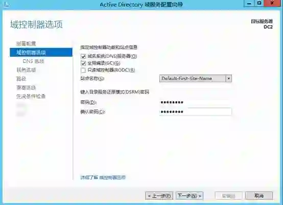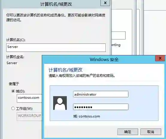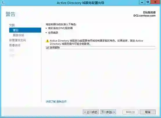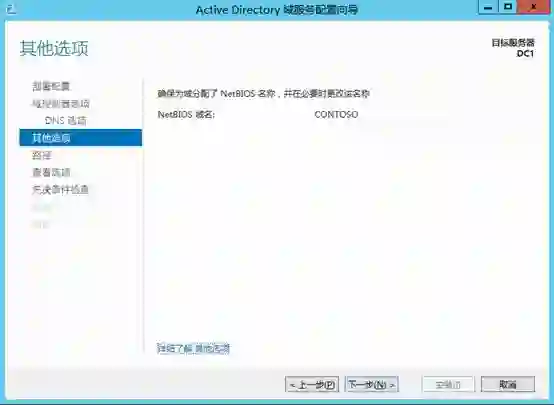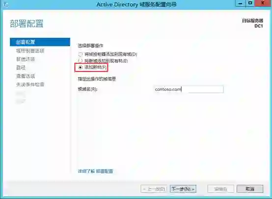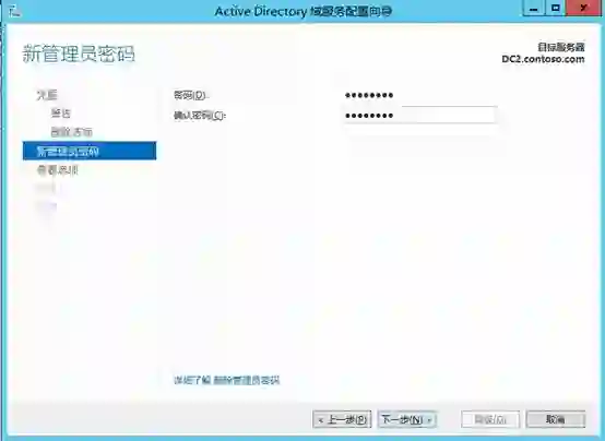 这里不同,将域控添加到现有域,输入域名contoso.com,并且输入现有权限添加域控的账户contoso\administrator的密码。