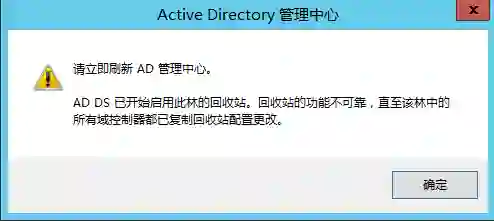 因为域内有多个域控制器,需要等设置值被复制到所有的域控制器后,ad回收站功能才会完全正常。(我做实验,节约性能还有一台辅助域控没有打开)