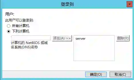 默认用户可以登录所有非域控制器的成员计算机,不过可以限制他们只能利用某些特定计算机来登录域。如下图限制只能登录server计算机。