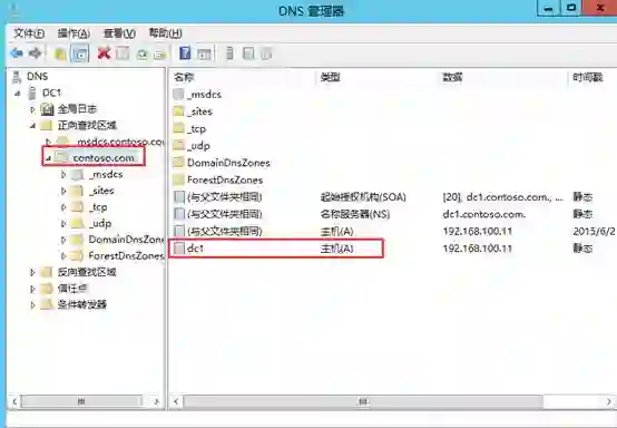 默认会有一个contoso.com的区域,主机记录表示域控dc.contoso.com已经正确的将其主机名与IP地址注册到DNS服务器内。