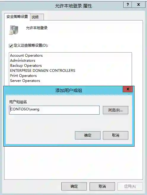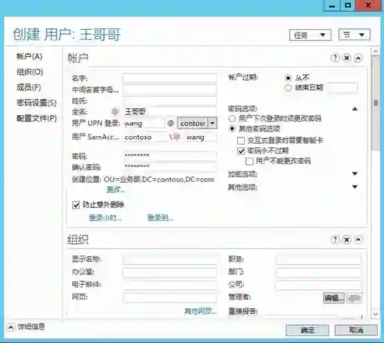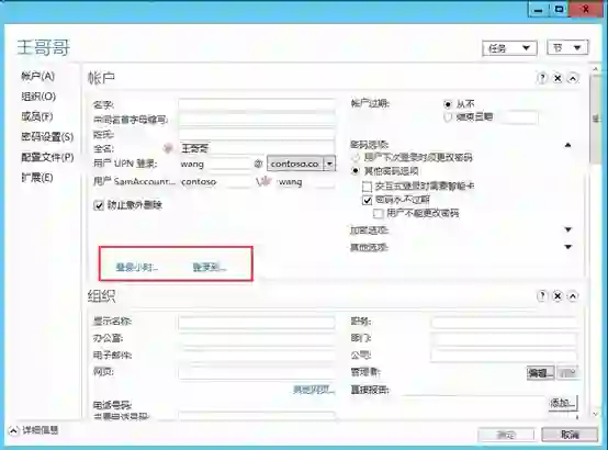 用户名SamAccountName登录:用户也可以利用此名称(contoso\wang)来登录。其中wang是NetBios名。同一个域中此名称必须是唯一的。Windows NT Windows 98等旧版系统不支持UPN,因此在这些计算机上登录时,只能使用此登录名。