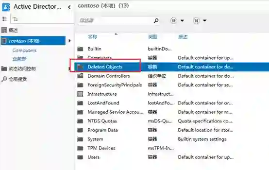 打开Active Directory管理中心,单击左侧的域名contoso,单击右侧的启用回收站