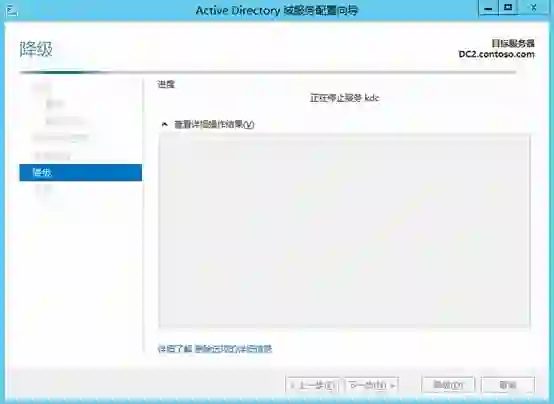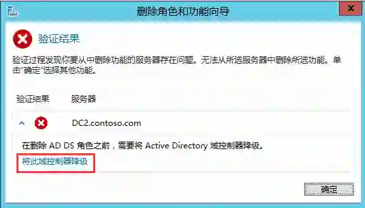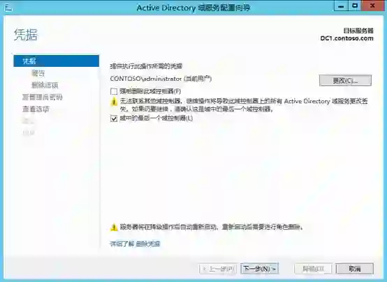 注:建议先将成员服务器server.contoso.com脱离域,因为在域删除后,这台服务器的账户就无法登陆域了(域删除后,也可以再将成员服务器脱离域)。
