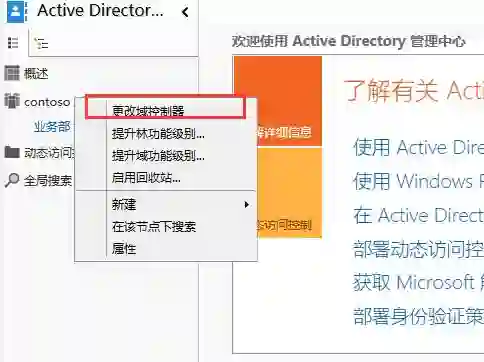如果要查询目前连接的域控制器,可以如下图在Active Directory管理中心控制台中将鼠标指针对着图中的contoso,他就会显示所连接的域控制器。如果要更改连接其他控制器,单击更改域控制器。