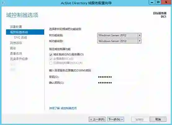 此处我们选择的为win 2012 ,此时域功能级别只能是win 2012,如果选择其他林功能级别,还可以选择其他域功能级别