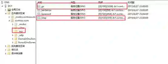 如果域控制器已经正确的将家里注册到dns服务器,应该还会有_tcp _udp等文件夹。单击_tcp文件夹后可以看到数据类型为服务位置(SRV)的_ldap记录,表示dc1.contoso.com已经正确的注册为域控制器。还能看到_gc记录全局编录也是由dc1.contoso.com所扮演。