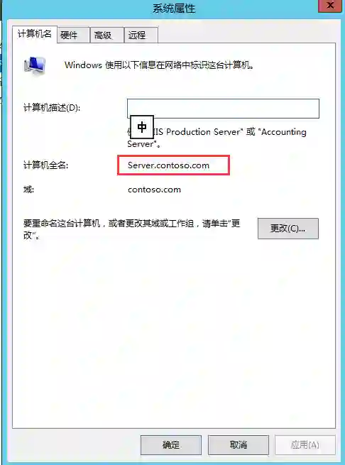 先修改ip地址,并且将dns指向自己,并且修改计算机名为DC1,升级成域控后,机器名称会自动变成dc1.contoso.com