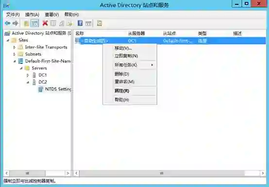 手动复制:到任何一台域控制器上选择Active Directory站点和服务-Sites-Default-First-Name Servers单击要接收设置的域控制器-NTDS Settings-立即复制。如下图DC1是操作主机,DC2是需要接收的域控