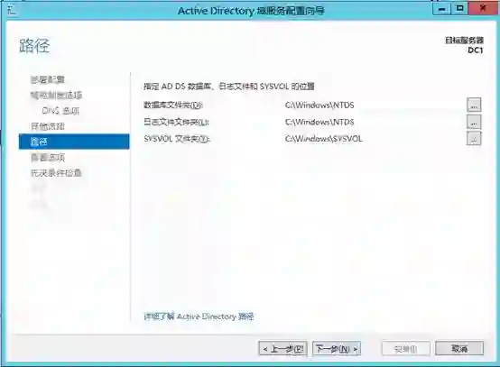注:AD需要一个SYSVOL文件夹来存储域共享文件(例如域组策略有关的文件),该文件夹必须位于NTFS磁盘,系统默认创建在系统盘,为了性能建议按照到其他分区。