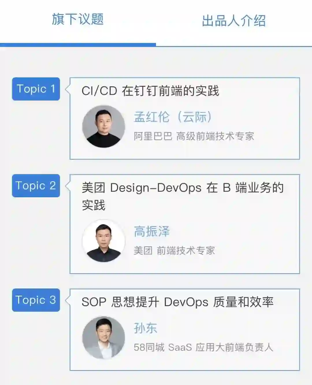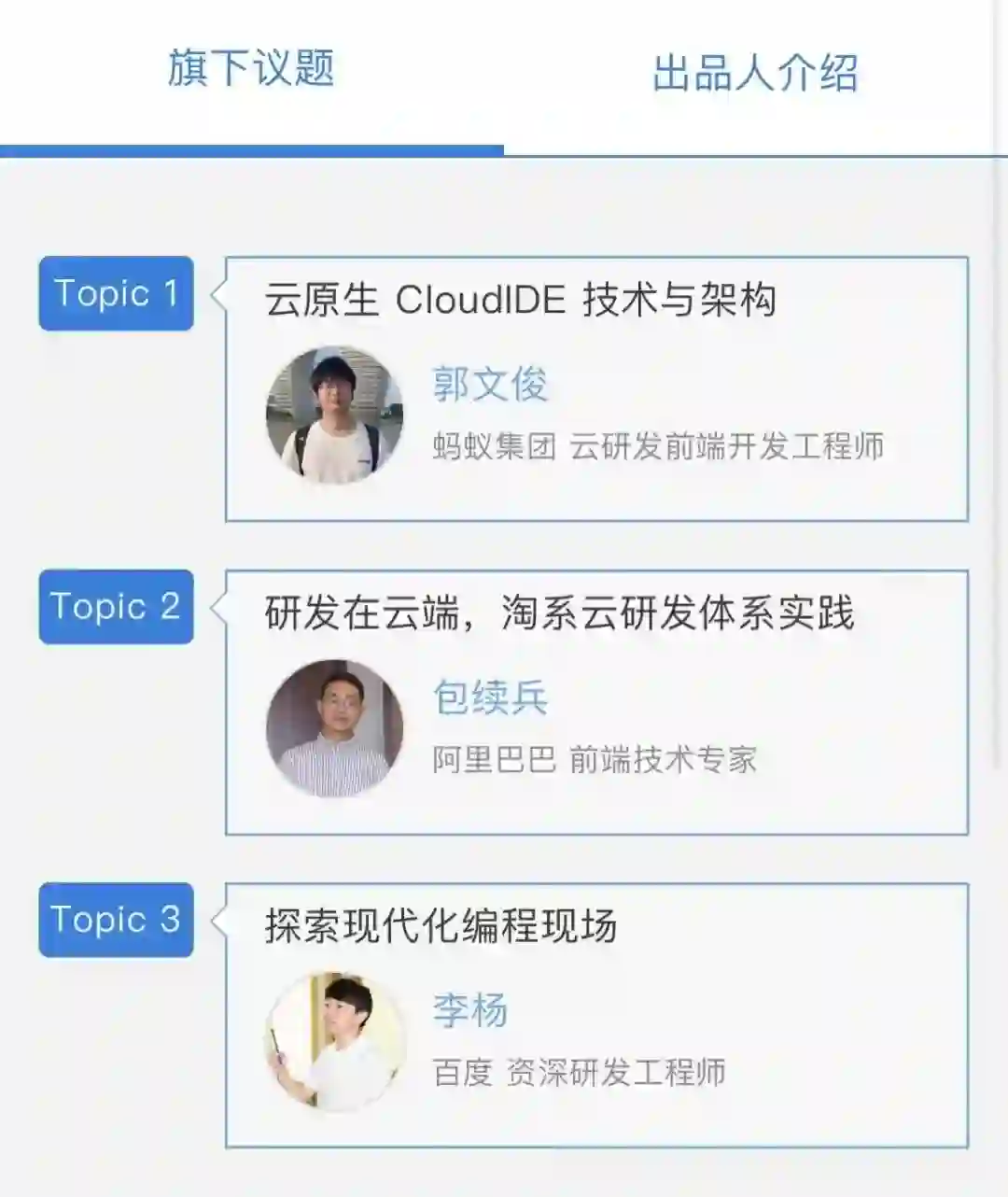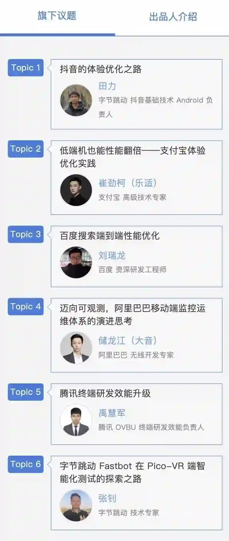 除此以外,跨端技术选型、移动端性能与效率优化、前端 DevOps 实践、云研发实践等专题的议题邀请进度已经过半,对应演讲信息如下: