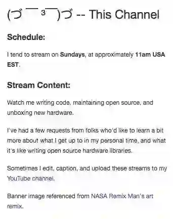 我第一次直播写代码是在去年七月份。想要直播一下我在业余时间内为开源项目领域所做的工作,尽管在youtube上的大部分直播都是关于游戏的。我比较擅长于NodeJS的硬件库方面的工作(尽管大部分项目都是自己的)。并且我在youtube上曾经开启过一个房间了,那为什么我不继续做下去?我的栏目可以叫做:基于JavaScript的硬件开发。