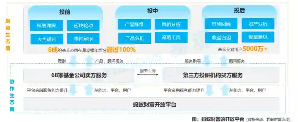 从智能运营引擎、智能决策参谋、智能服务内容生成再到智能市场情绪感知、及智能风控合规,蚂蚁财富通过五大AI能力的输出,全方位优化基金公司用户运营,在用户营销、决策支持、服务内容生产、用户互动、风险控制等方面的智能化经营,帮助基金公司大幅降低运营成本并提升整体的运营效率及服务用户的深度,从而构成完善的用户服务生态体系。