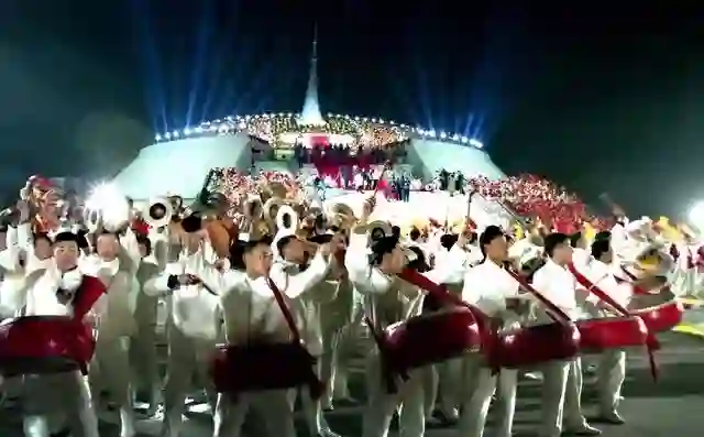 1990年,第十一届亚运会在北京举行,吉祥物“盼盼”火遍全国。图为气势恢宏的亚运会开幕式。