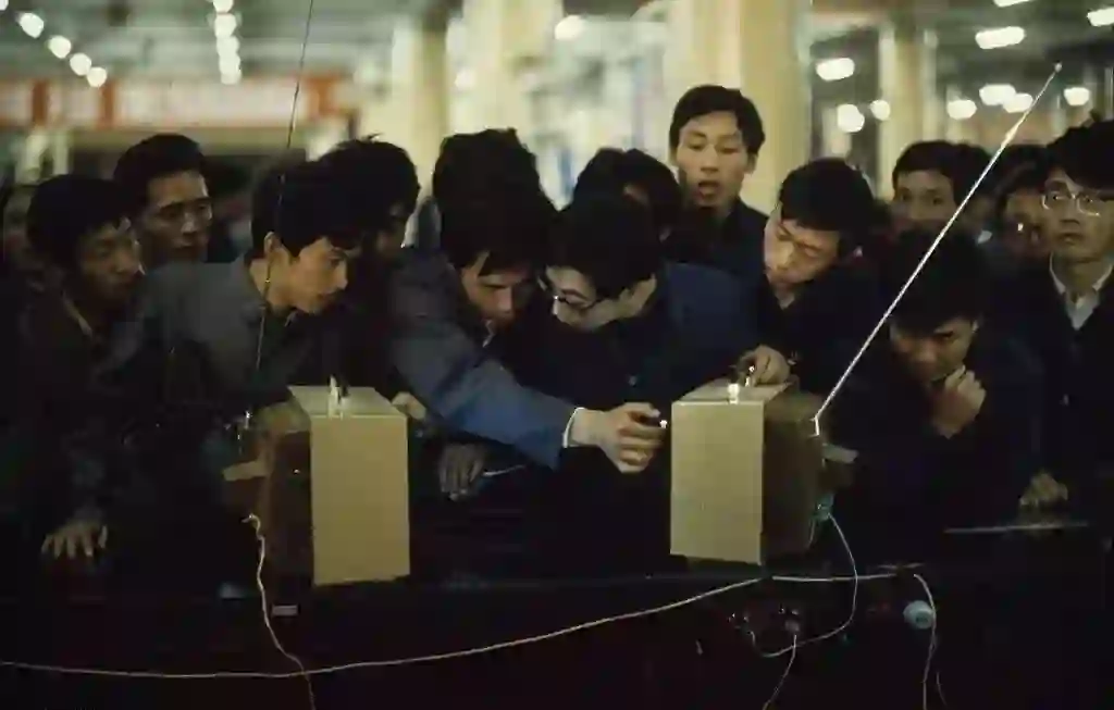 1980年,在上海第一百货商场内,几名男子在柜台调试电视机。买电视是当时家里的大喜事,街坊四邻的孩子、老人都会跑来看新奇。