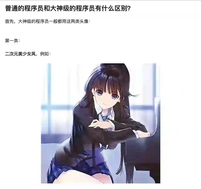 知乎上,在一个很有意思的问题“普通的程序员和大神级的程序员有什么区别?”下方,答主 Momenta 神总结了 2 个大神级程序员选择头像的风格特质,一是二次元美少女风,二是喜欢萌宠,尤其爱猫。