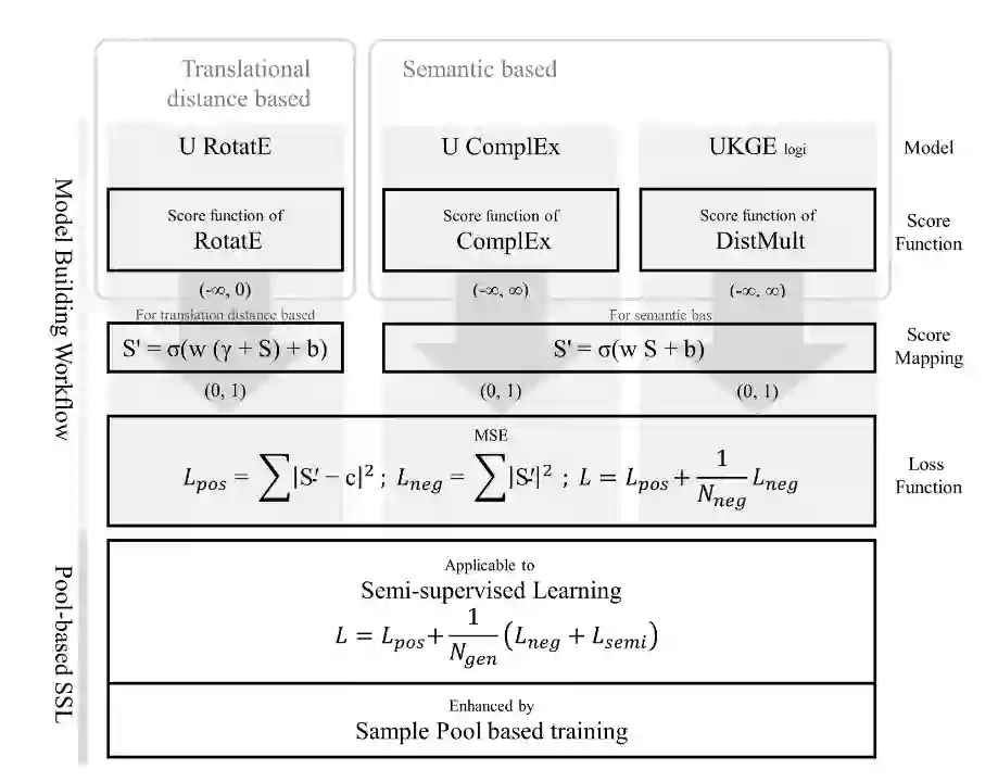 总体框架如图1所示,主要由不确定性预测模型和基于池的半监督学习模型组成。不确定性预测模型使用知识嵌入的评分函数来预测三元组样本的置信度,半监督学习框架能更好地处理未出现过的三元组,而不是将其直接转换为置信度为0的负样本。样本池可以进一步提高前途学习的质量。