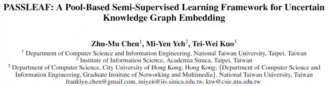 论文引用:Citation: Chen, Z.M., Yeh, M.Y. and Kuo, T.W., 2021, May. PASSLEAF: A Pool-bAsed Semi-Supervised LEArning Framework for Uncertain Knowledge Graph Embedding. In Proceedings of the AAAI Conference on Artificial Intelligence (Vol. 35, No. 5, pp. 4019-4026).