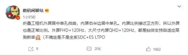 @数码闲聊站 今日曝光了 vivo 折叠屏新机 vivo NEX Fold 的屏幕配置,该机外屏采用微曲设计,支持 FHD+ 分辨率 120Hz,内屏比例接近正方形,支持 QHD 分辨率 +120Hz,全都是自适应高刷。相比竖置布局的折叠屏机型,内屏越“宽”外屏的体验也就更类似一般直板机,但相对的软件、操作系统就要花更多的时间去调试、修改。据此前爆料,vivo NEX Fold 将采用行业首发硬件新技术,屏幕影像和快充在折叠屏里都将是 TOP 水平。