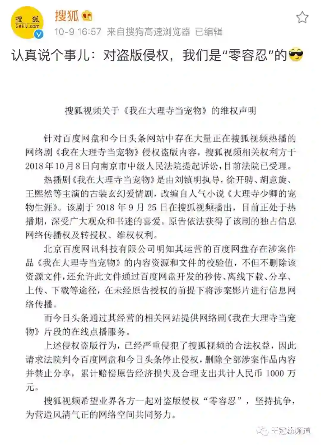 10月9日(今天下午),搜狐官微发布一则微博称:“认真说个事儿:对盗版侵权,我们是“零容忍”的。”并附上一篇搜狐视频关于《我在大理寺当宠物》维权声明的长文。