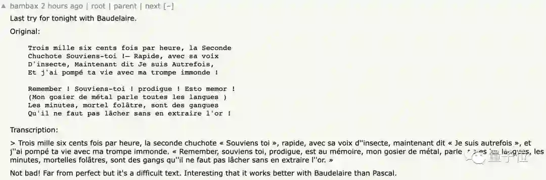不仅是英文,有人用法国诗人波德莱尔的《恶之花》进行了语音测试,得到的文本几乎与原文一致。