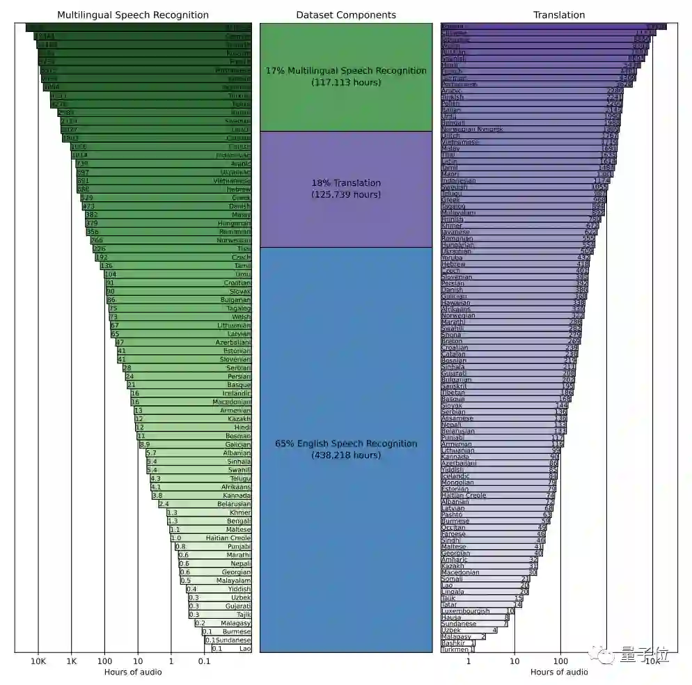 具体而言,65%(438218小时)是英语音频和匹配的英语文本,大约18%(125739小时)是非英语音频和英语文本,而最后17%(117113小时)则是非英语音频和相应的文本。