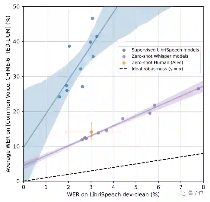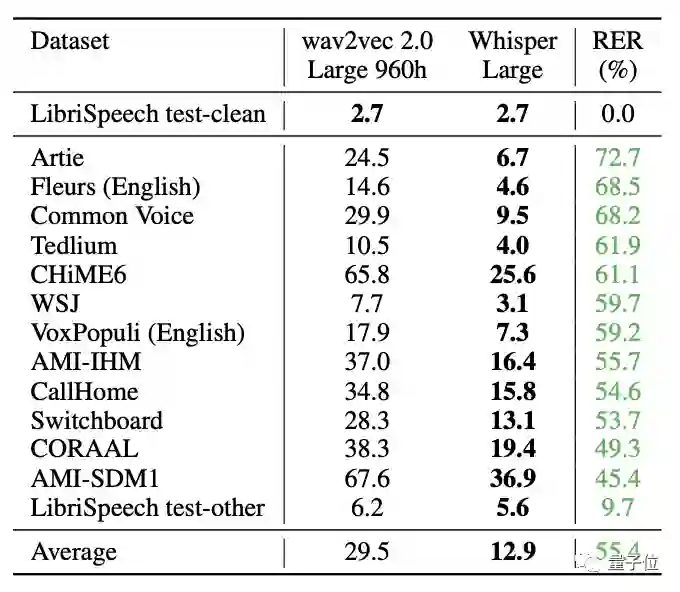 虽然这一数值与Wav2vec 2.0一样,但在零样本性能上,Whisper明显更稳健,平均误差减少了55%。