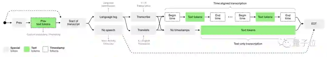 解码器被训练来预测相应的文本标题,并混合特殊标记,指示单一模型执行诸如语言识别、多语言语音转录和英语语音翻译等任务。
