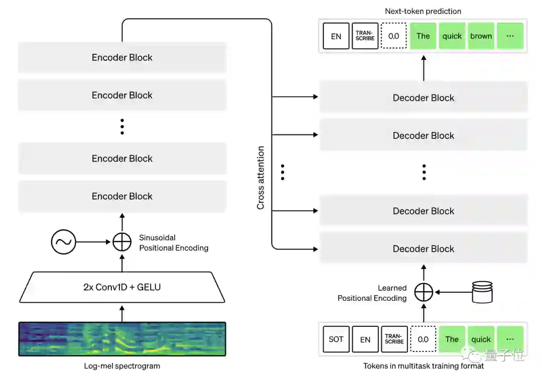输入音频被分成30秒的片段,再转换成log-Mel谱图,然后传入编码器。