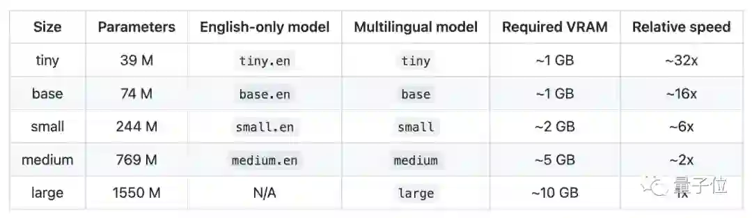除此之外,研究人员还为Whisper设置了5种不同的型号,以下是各模型大致的内存需求和相对速度,使用者可以自行选择。