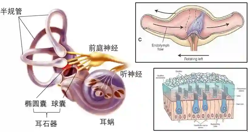 前庭器官主要位于我们的内耳中,它包括三个互相垂直的半规管以及由椭圆囊和球囊组成的耳石器。半规管内含有淋巴液,当我们左右转动的时候,里面的淋巴液由于惯性作用将会往相反方向推压毛细胞的纤毛,引起毛细胞的兴奋,并向该侧的神经中枢发送大量的神经冲动,这个时候我们就知道自己在向左转还是向右转。而耳石器,顾名思义,它里面含有大量的碳酸钙盐结晶,就像小石头一样。当我们在水平面上作直线变速运动的时候,这种“小石头”同样也会由于惯性作用牵拉毛细胞的纤毛,造成神经冲动。这两套前庭感觉器官分别感受我们运动过程中的角加速度和线性加速度。