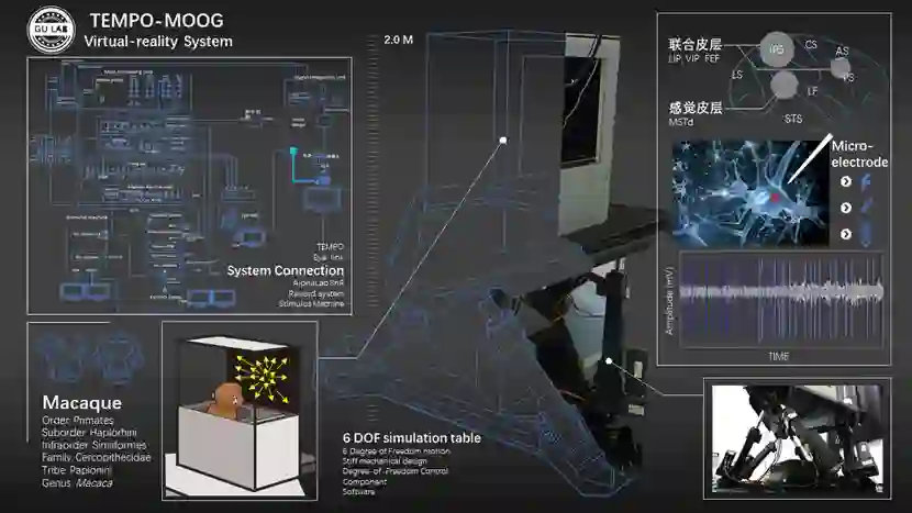 为了研究前庭觉与视觉是如何影响我们空间感知的,我们实验室建立了一套前庭-视觉虚拟现实系统。这套系统由两部分组成,分别是负责提供空间信息的 MOOG 系统,和负责控制指令的 TEMPO 系统。MOOG 系统主要包括一个六自由度的运动平台,它通过平台的真实运动提供前庭感觉,通过显示器的光流信息模拟视觉的刺激。猕猴在实验舱内或者根据单一的视觉刺激,或者根据单一的前庭刺激,或者根据两种刺激的不同组合来做行为任务。而 TEMPO 系统则负责实时控制这些刺激的给出以及记录猕猴的行为结果。