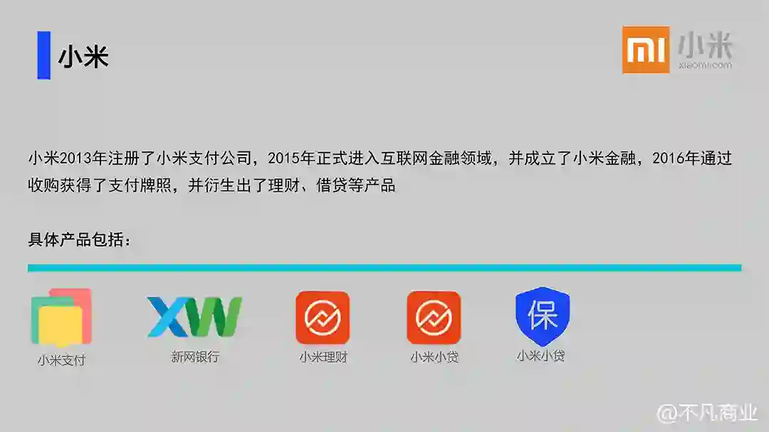 新网银行:小米参与投资创立的互联网银行,对标网商银行和微众银行;
