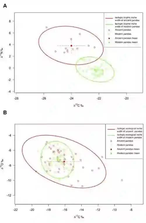通过模型计算比较历史时期与现生大熊猫同位素生境生态位宽度大小,两者相差悬殊,历史时期的是现生的3倍多,有意思的是现生大熊猫的椭圆完全被历史时期的覆盖。这与考古研究中,大熊猫化石出土地点的分布区特点相符,其北至北京周口店,南到中南半岛。大熊猫在进化过程中,不仅生活在包含当前所栖息的高山森林地带,也栖息在一些亚热带森林、森林边缘,即森林与开阔地的结合处、甚至森林的开阔地,只是在演化历程中,由于各种原因才逐渐退缩到四川、陕西和甘肃的现生分布区。