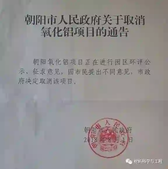 8月1日,辽宁朝阳市政府发布公告,决定停止“朝阳氧化铝项目”。公告发布几个小时后,朝阳市政府就对公告内容进行了修改,将“停止”一词改为了“取消”。