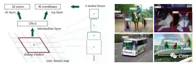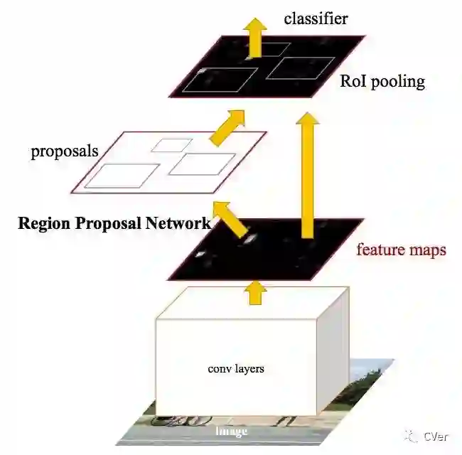 上面两种方法都依赖于Selective Search生成候选区域,十分耗时。考虑到CNN如此强大,Faster R-CNN提出使用CNN来得到候选区域。假设有两个卷积神经网络,一个是区域生成网络,得到图像中的各个候选区域,另一个是候选区域的分类和边框回归网路。这两个网络的前几层都要计算卷积,如果让它们在这几层共享参数,只是在末尾的几层分别实现各自的特定的目标任务,那么对一幅图像只需用这几个共享的卷积层进行一次前向卷积计算,就能同时得到候选区域和各候选区域的类别及边框。