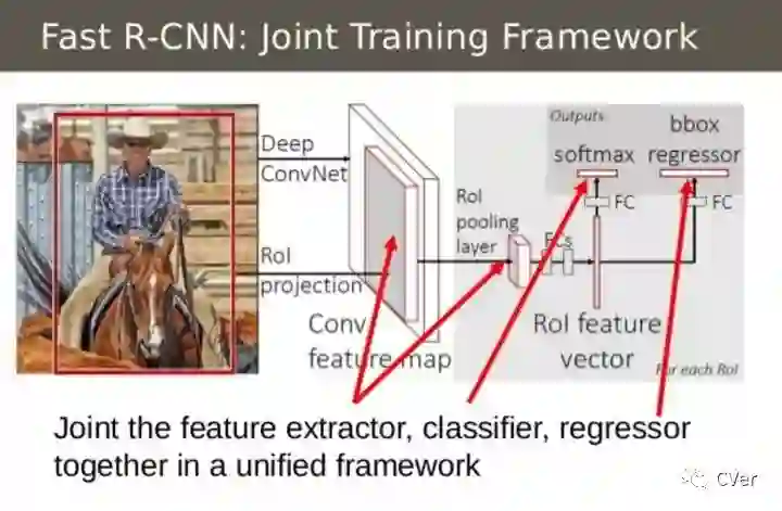Fast R-CNN的第二点创意是把之前独立的三个步骤(特征提取、分类和回归)放到一个统一的网络结构中。该网络结构同时预测一个候选区域的物体类别和该物体的边界框,使用两个全连接的输出层分别进行类别预测和边框预测(如下图所示),将这两个任务进行同时训练,利用一个联合代价函数:
