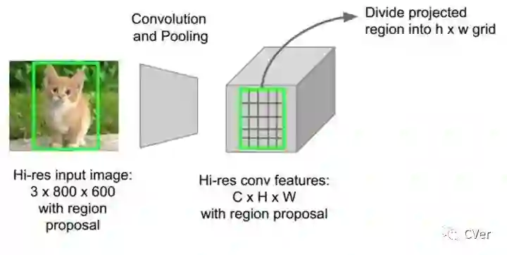 于是Fast R-CNN提出了一个ROI Pooling的方法,先对输入图像使用一次CNN前向计算,得到整个图像的特征图,再在这个特征图中分别取提取各个候选区域的特征。由于候选区域的大小不一样,而对应的特征需要要具有固定的大小,因此该方法对各个候选区域分别使用POI Pooling, 其做法是:假设第 i 个候选区域ROI的大小 hi x wi, 要使输出的大小 h x w,那么就将该ROI分成 h x w 个格子,每一个格子的大小 (hi/h) x (wi/w), 然后对每一格子使用max-pooling得到大小 h x w 的特征图像。