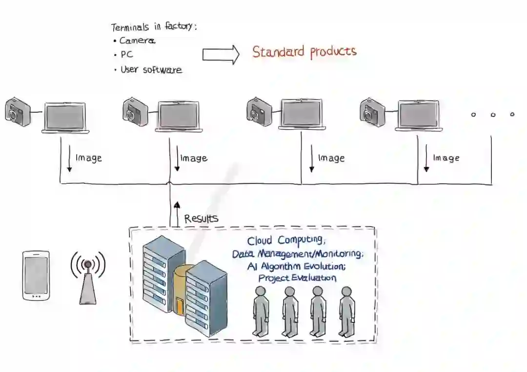 美的工业视觉检测云平台采用了这样的架构:前端图像收集 - 云端大数据分析 - 深度学习模式识别,解决视觉检测环境的非标难题。前端设备收集的图像数据通过 4G 或 Wi-Fi 传输到云端,通过深度学习框架,经由训练获得非标准化视觉检测特征,最终打造出通用化、智能化的瑕疵检测能力。